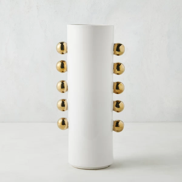 An eye-catching addition to any shelf or table. This vase is crafted of ceramic with a bright white finish and dimensional bauble design in gold.