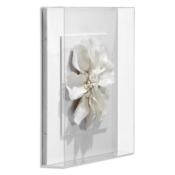 - Flower sculpture on linen backing set in an acrylic shadowbox.