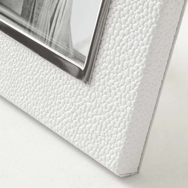 A stylish way to display a favorite snap, this picture frame enjoys a mix of textures with a white faux-shagreen finish and sleek silver border.