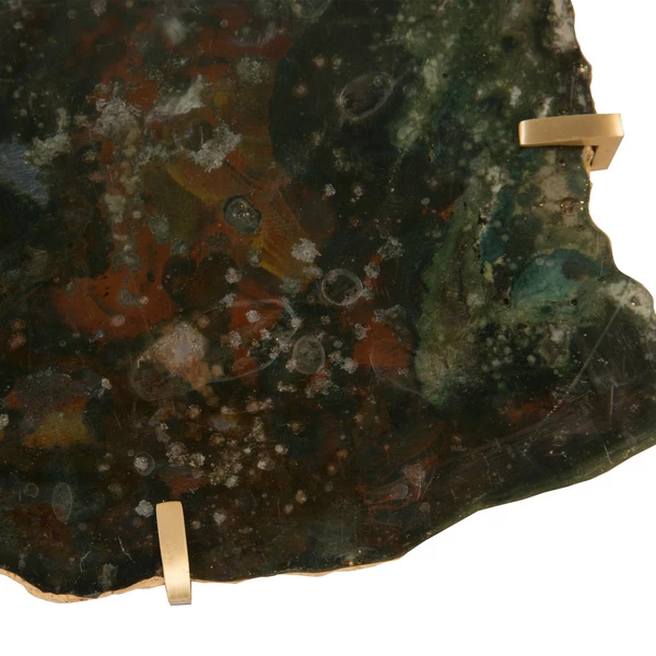 Prong-set in brass, this stunning gem wall tile is made of natural stone with unique veining along its surface, making it a one-of-a-kind piece for your wall.