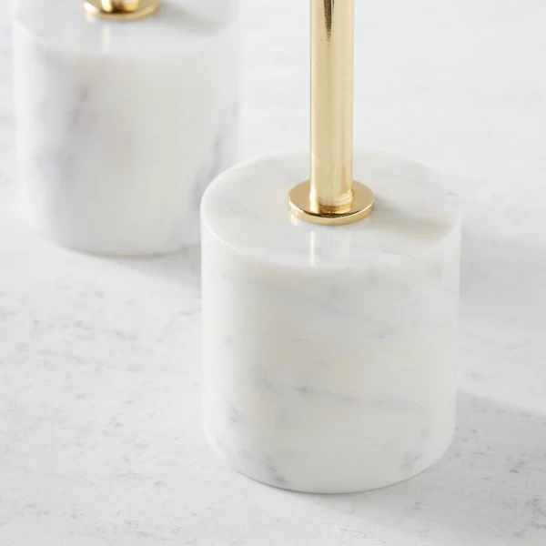 Pairing gold tone metal with white marble, our Greta taper holders make a chic addition to any space.