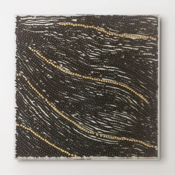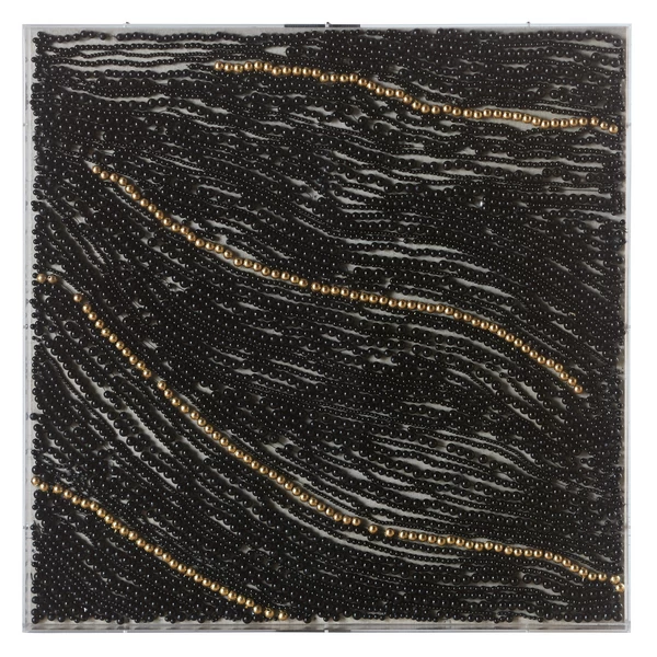 Perfect for adding texture, drama, and shine to your wall, this captivating composition features strands of black and gold beads displayed in a clear acrylic shadowbox frame.