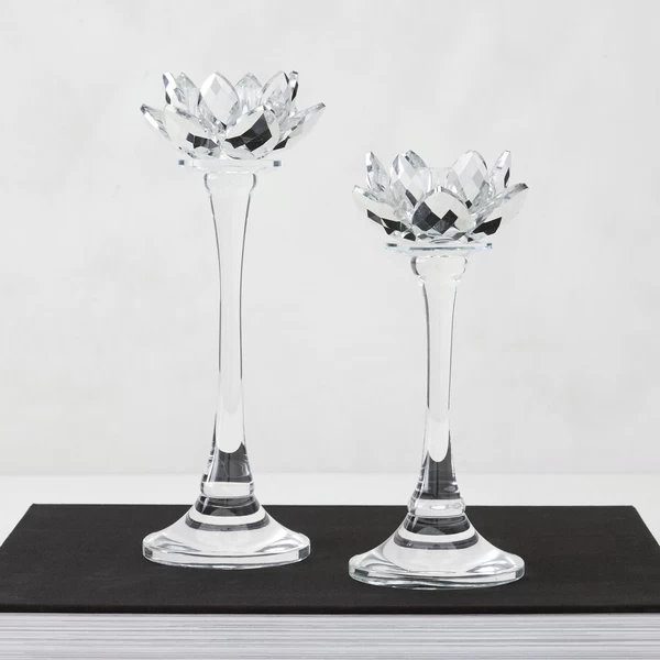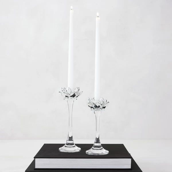 Give your evening a glam glow. This taper candle holder features an intricately faceted glass lotus at its base for eye-catching candlelight that dances the night away. Sold separately.
