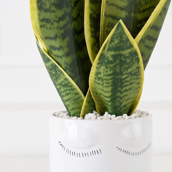 A faux premade with a touch of whimsy featuring green and yellow Mother In Laws Tongue in a painted planter.