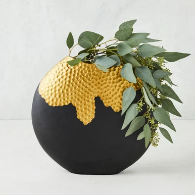 Whether it’s displaying blooms or serving as a decorative accent piece, this black-and-gold vase makes a statement on any shelf.