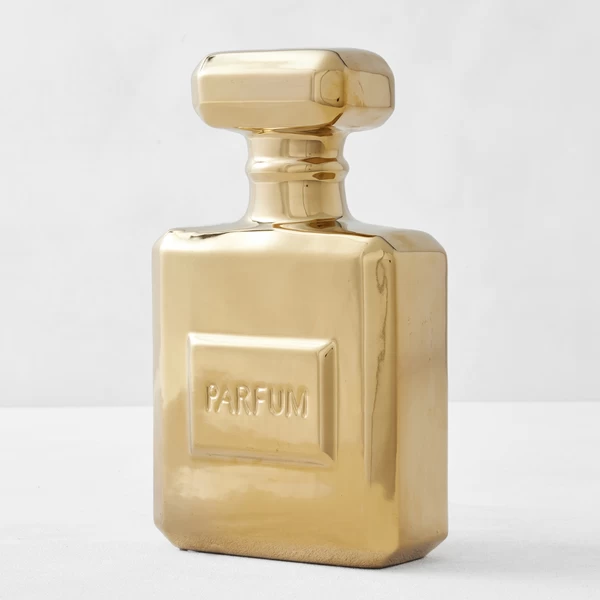 Written in French, our Parfum Bottle Coin Bank makes for a chic way to collect your coins. Detailed in the fashion of an elegant, clean lined perfume bottle makes it all the more stylish of a bank to display. Crafted of ceramic, our coin bank is finished with a metallic gold hue, with the coin slot on the bottle stopper and opening at the bottom that closes with a rubber stopper.