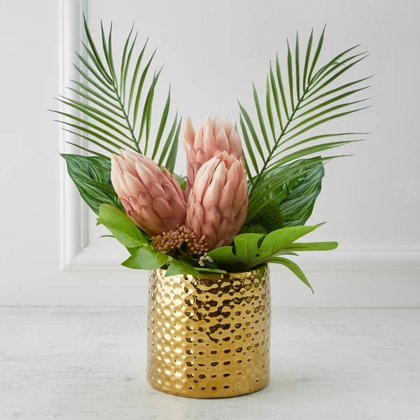 Housed in a hammered gold-finished vase, this stunning faux-protea arrangement will look lush and lifelike all year long.