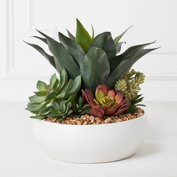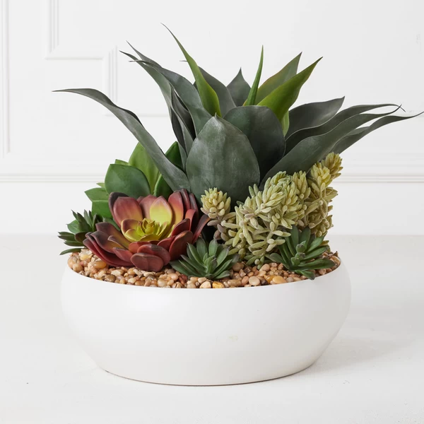 The premade arrangement of faux succulents in a low white bowl is a visually stunning and modern centerpiece that brings nature’s beauty into any space.