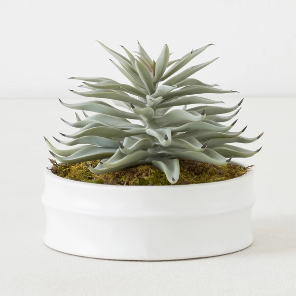 A visually stunning faux arrangement featuring a large single succulent in a round white bowl.
