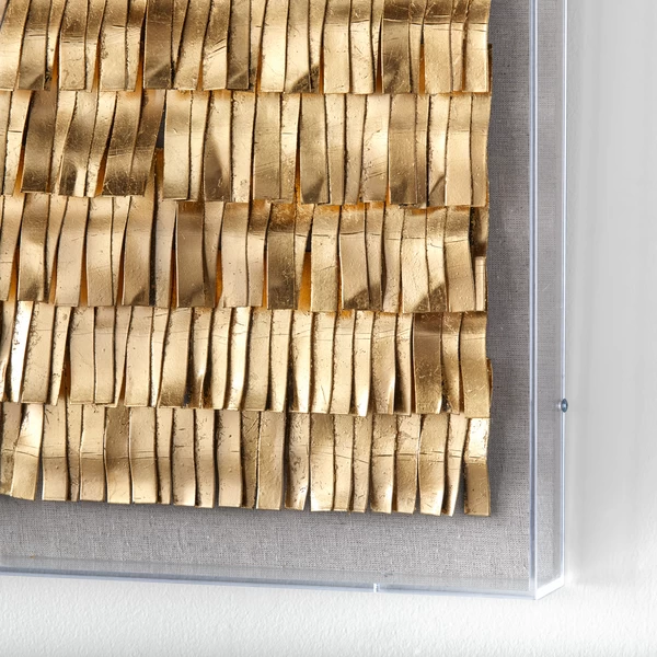 Looking to add something sleek and sophisticated to your space? This piece entitled Symphony fits the bill. Curved iron elements are painted in gold and set in a clear acrylic shadowbox. Display this stunner on your wall, and guests are sure to inquire about it.